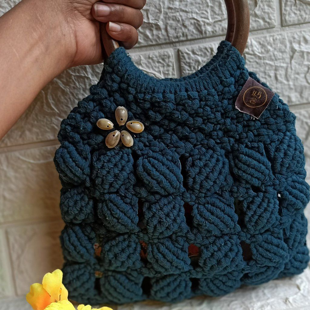 Experience the perfect fusion of boho-chic and beachy charm. Order your Royal Blue Macramé Shell Bag with Wooden Handle today and make a stylish, sustainable statement!